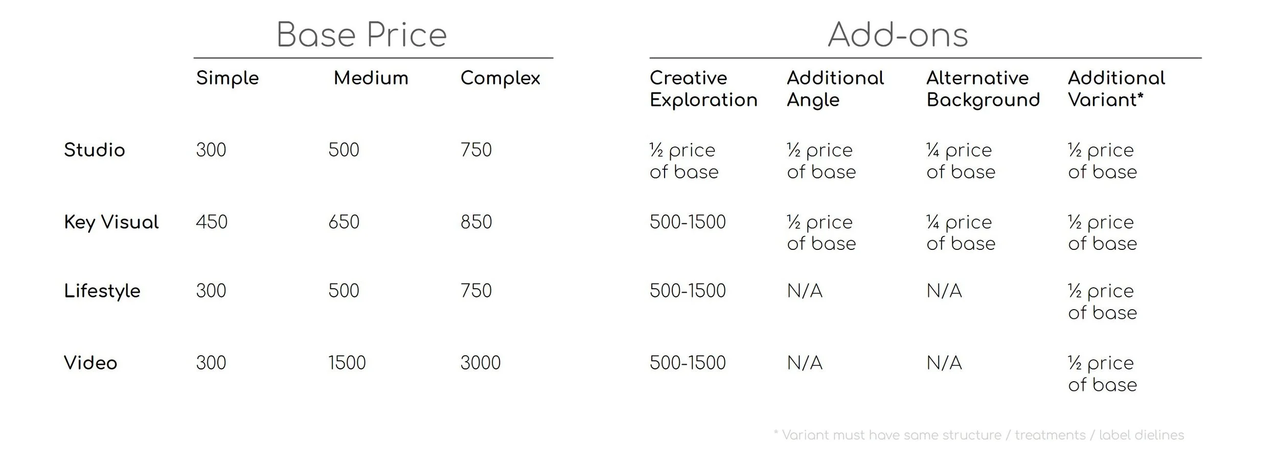 Thank you for the opportunity to work together. Below is an overview of pricing along with various examples of work. As mentioned in our call, I always strive to build not only creative relationships that fosters amazing work, but also business relationships that ensure you make a margin. We prefer to not work with end-clients so maintaining strong relationships with our creative agency partners is very important to me.